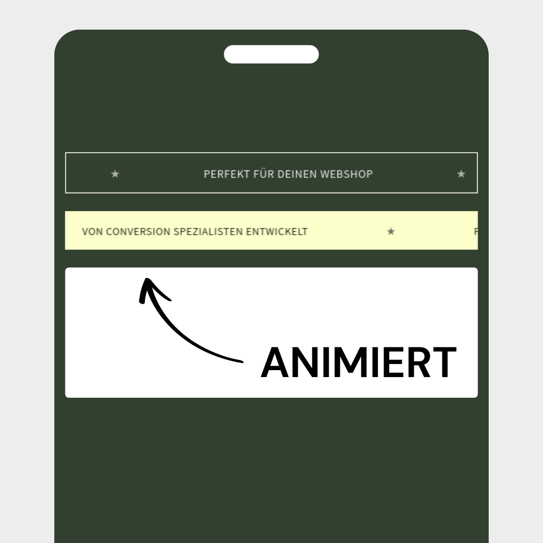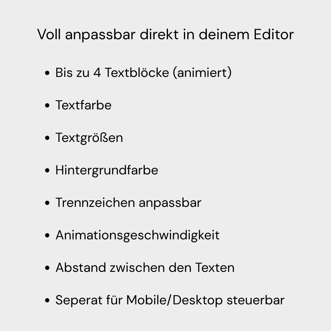 Bis zu vier Texte laufen abwechselnd durch, inklusive frei wählbarer Trennzeichen, Farben und Geschwindigkeiten – alles komplett editierbar im Shopify Editor.