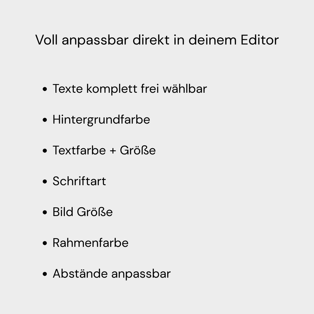 Alle Texte, Bilder und Farben sind frei im Shopify Editor anpassbar – für maximale Wirkung bei minimalem Platzbedarf.