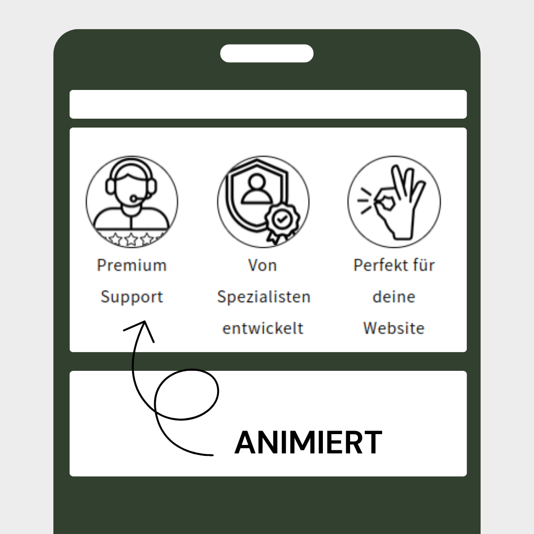 Die Section ist vollständig im Shopify Editor anpassbar – Farben, Icons, Texte und sogar die Animation. So passt sie sich deiner Marke nahtlos an – und steigert ganz nebenbei deine Conversionrate.