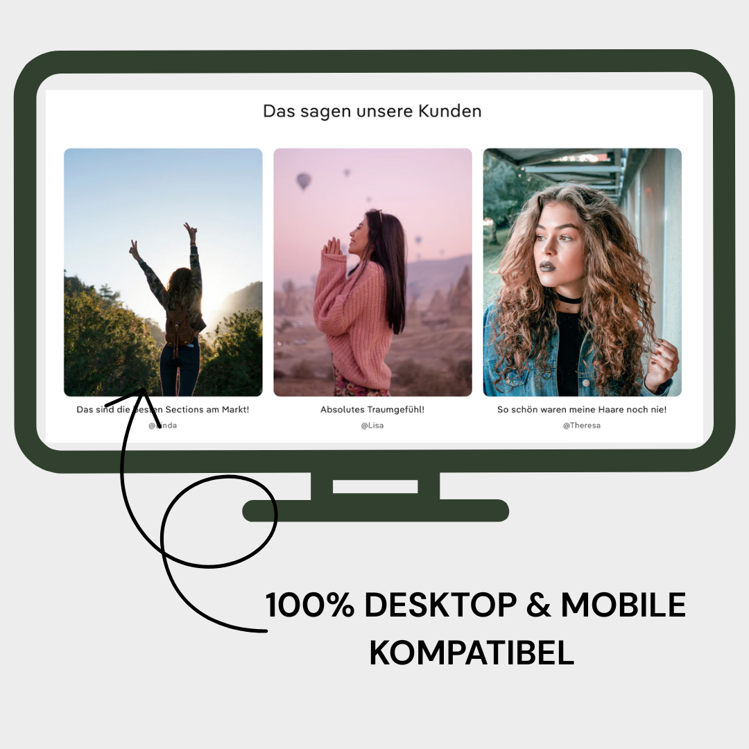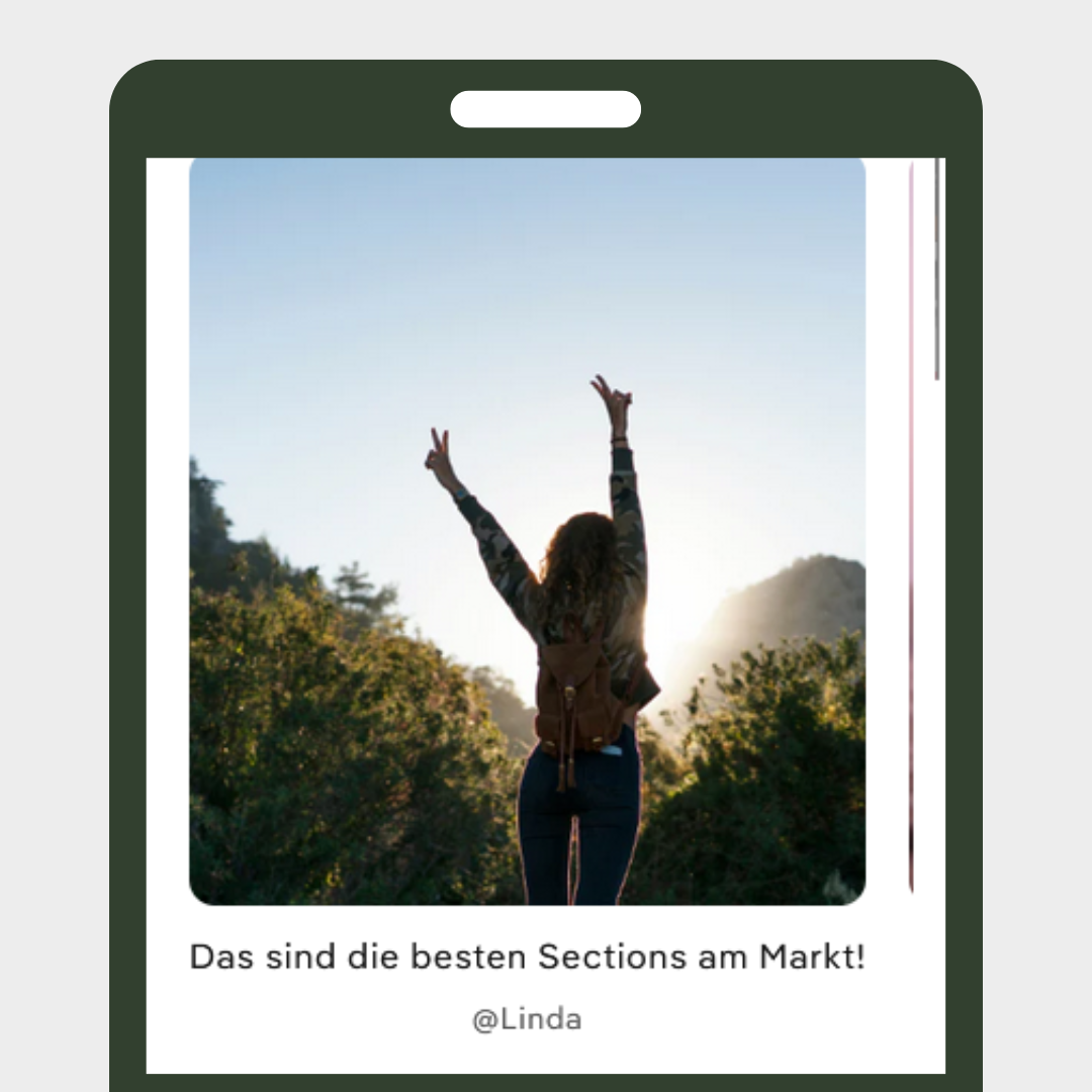 Präsentiere die besten Kundenfotos, Instagram-Posts, UGC Videos oder positive Zitate in einem eleganten Carousel direkt auf deiner Produktseite oder Startseite. Welche Inhalte du zeigst, in welcher Reihenfolge sie erscheinen und wie das Design wirkt, steuerst du dabei kinderleicht und flexibel direkt im Editor.